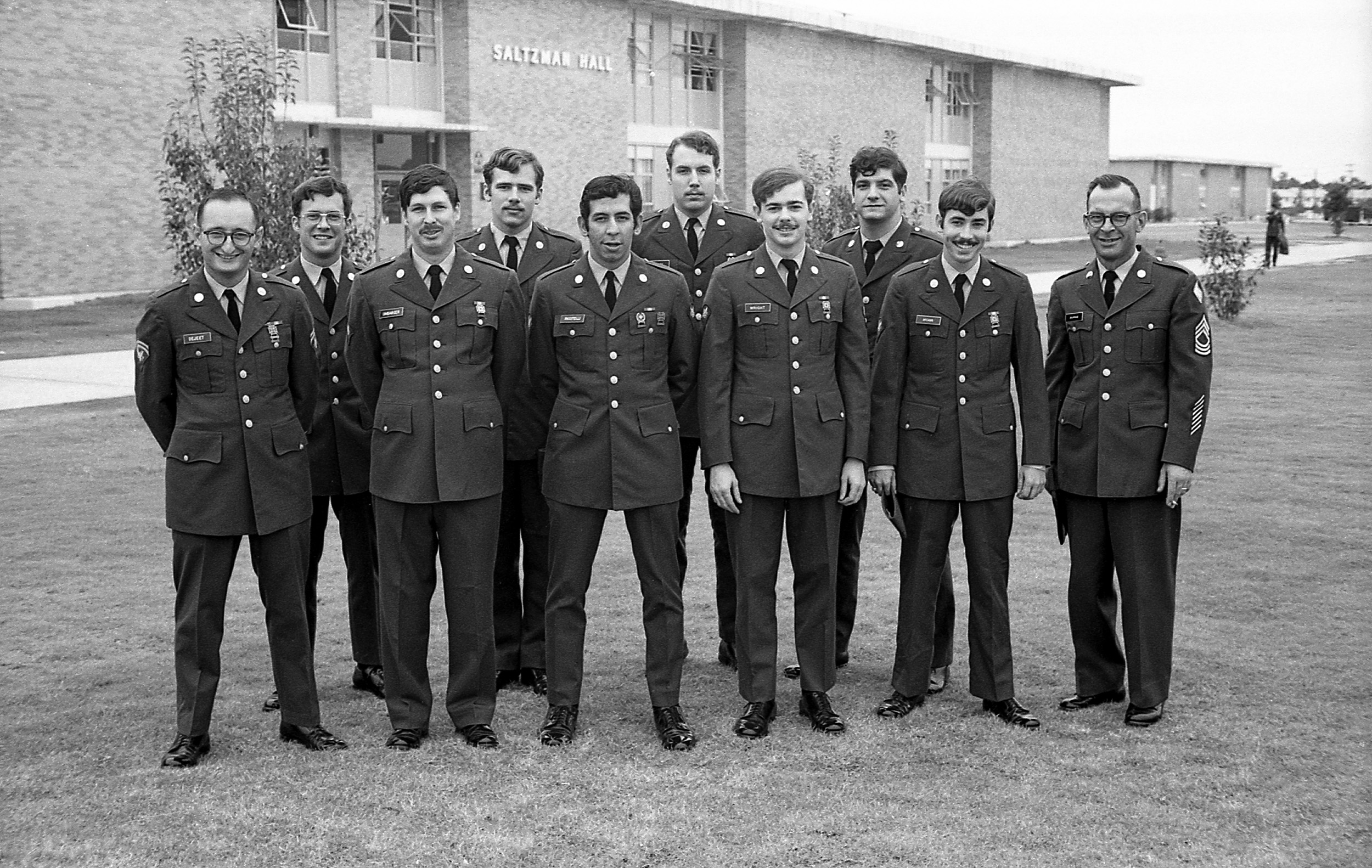 One day near the end of the 2nd course, 35B30, I showed up in class after working at the photo facility to find that my classmates were wearing their “Class A Uniforms.” I did not get the message that this was our graduation day, so I was wearing the normal fatigues. I had a camera and a roll of B&W film with me and shot a few pictures in the classroom (I staged the shot of a few of the guys sleeping in class). Also, we went outside and I did some last-minute graduation pictures minus me. See pix. They are a little unconventional for Army pictures. Fun. I don’t even know who the smoking Master Sergeant was, but he showed up for the graduation. I wish I had asked him to shoot one including me in the group, even though I was not dressed for the occasion. I don’t even think I thought of it.